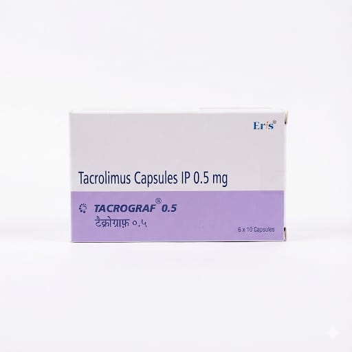 Tacrograf 0.5 mg Capsules (Tacrolimus IP) contain tacrolimus, an immunosuppressant medicine used to prevent organ rejection in patients who have undergone kidney, liver, or heart transplants. It works by suppressing the immune system to help the body accept the transplanted organ. The capsules are taken orally as prescribed by a doctor, with regular monitoring of blood levels. Tacrograf helps maintain transplant health and reduce the risk of rejection. It must be used under strict medical supervision due to possible side effects and drug interactions.