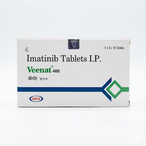 Veenat 400 mg Tablets contain imatinib, a targeted anticancer medication used to treat certain types of cancer such as chronic myeloid leukemia (CML) and gastrointestinal stromal tumors (GIST). Imatinib works by blocking specific abnormal proteins that signal cancer cells to grow. These tablets are taken orally as prescribed by an oncologist. Veenat helps control disease progression and improve treatment outcomes. It must be used under strict medical supervision due to possible side effects and required monitoring.