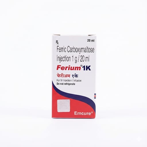 Ferium 1 g/20 mL Injection (Ferric Carboxymaltose) is an intravenous iron preparation used to treat iron deficiency anemia in adults, especially when oral iron supplements are ineffective or not tolerated. It works by rapidly replenishing iron stores in the body, supporting the production of healthy red blood cells and improving hemoglobin levels. The injection is administered intravenously by a healthcare professional, usually as a single or divided dose depending on iron requirements. Ferium provides a fast and effective correction of iron deficiency. It should be used under medical supervision due to possible side effects and the need for monitoring.